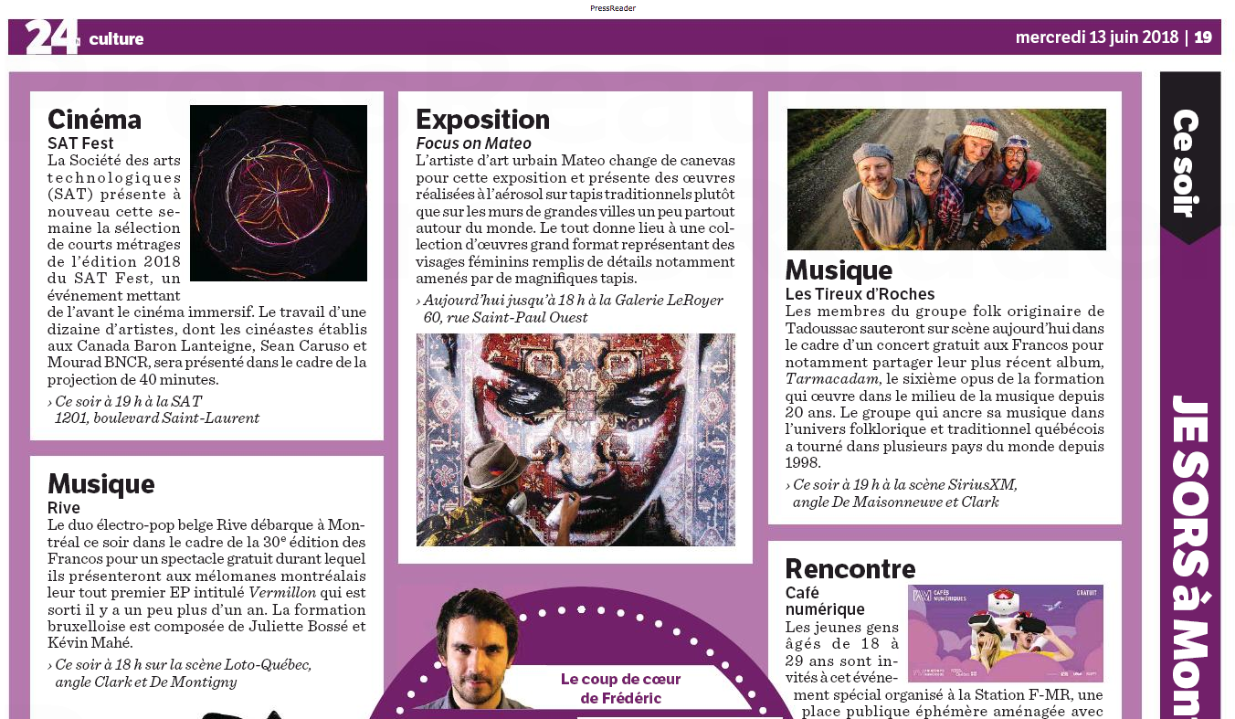 ARTICLE IN FRENCH | Art review of Focus exhibition on Mateo, published in the culture section of 24H Montréal on June 13th 2018.